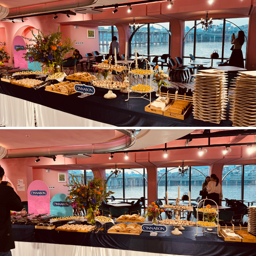 케이터링도 브랜드 컨셉에 맞춰 카멜레온처럼 변신을 잘해야 합니다. 저희가 워낙 글로벌 브랜드, 제약회사, 인터넷, 컨퍼런스 등등을 하다 보니, 다소 "럭셔리나 고급미만 지향하는 것이 아니냐" 하시는데, 러블리, 큐트 한 감성적 스타일링도 잘합니다. 러블리하지만 유치하지 않게, 핑크핑크 하지만 고급스럽게 풀어내는 것이 실력이지요. 이번 시나본 압구정 오프닝 파티는 로맨틱 한강뷰와 아트 감성을 담은 럭셔리 스위트 카페 무드로 연출했습니다.