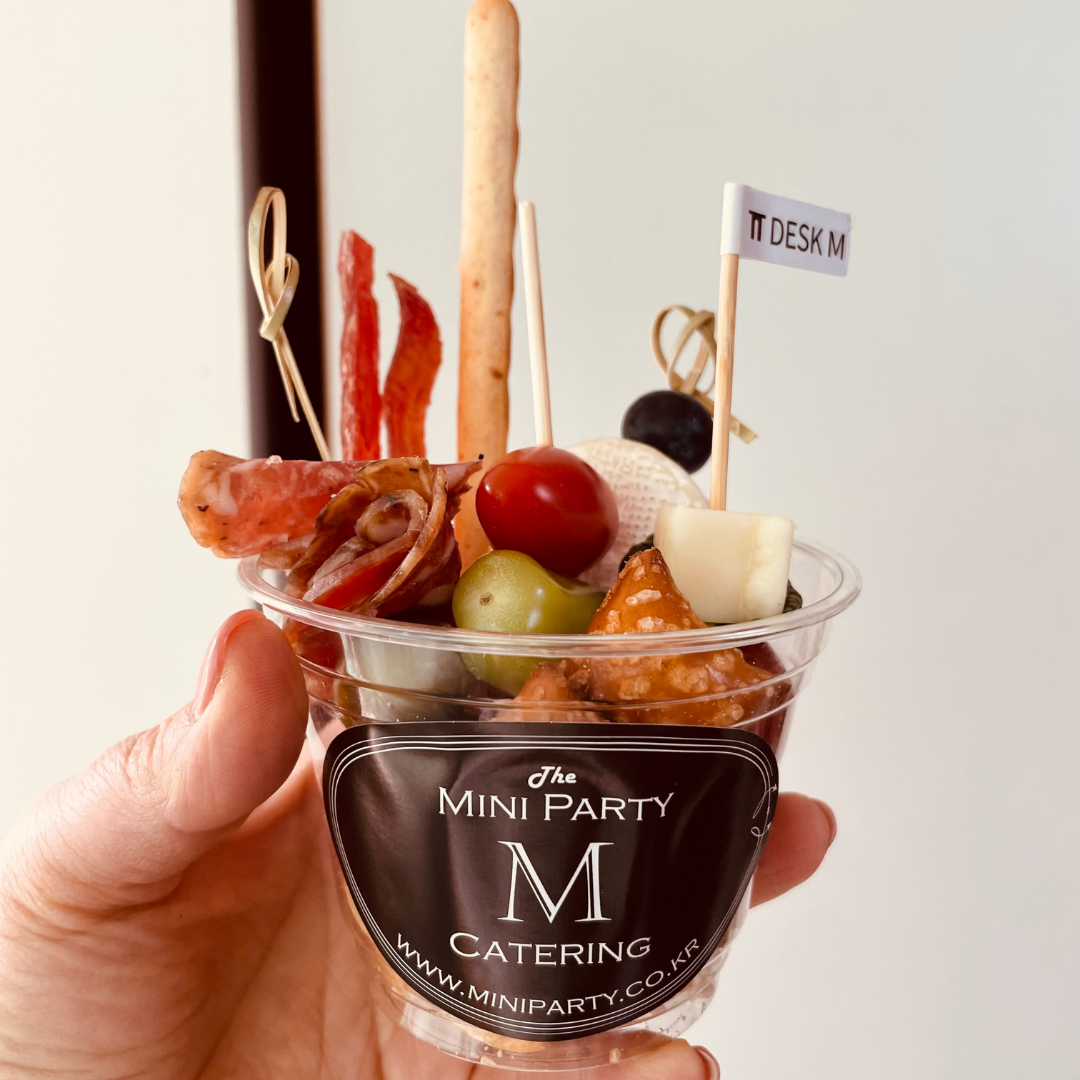 1인용 샤퀴테리는 다양한 형태로 준비할 수 있습니다. 물론 브랜딩에 강한 미니파티가 가장 잘하는 일이기도 하죠. 이때 종이컵, 유리컵, 우드 접시, 종이접시 등등 다양한 형태로 변형이 가능하죠. 예를 들어 자리에 앉아서 진행하는 행사인 경우, 접시나, 기프트 박스 형태가 아무래도 좋은 형태일 것 같고요. 스탠딩 행사나 뷔페 형태의 케이터링이 필요한 자리라면 컵 형태가 드시기도 편할 것입니다. 이것이 1인용 사퀴테리의 가장 좋은 장점이지 않을까 합니다.