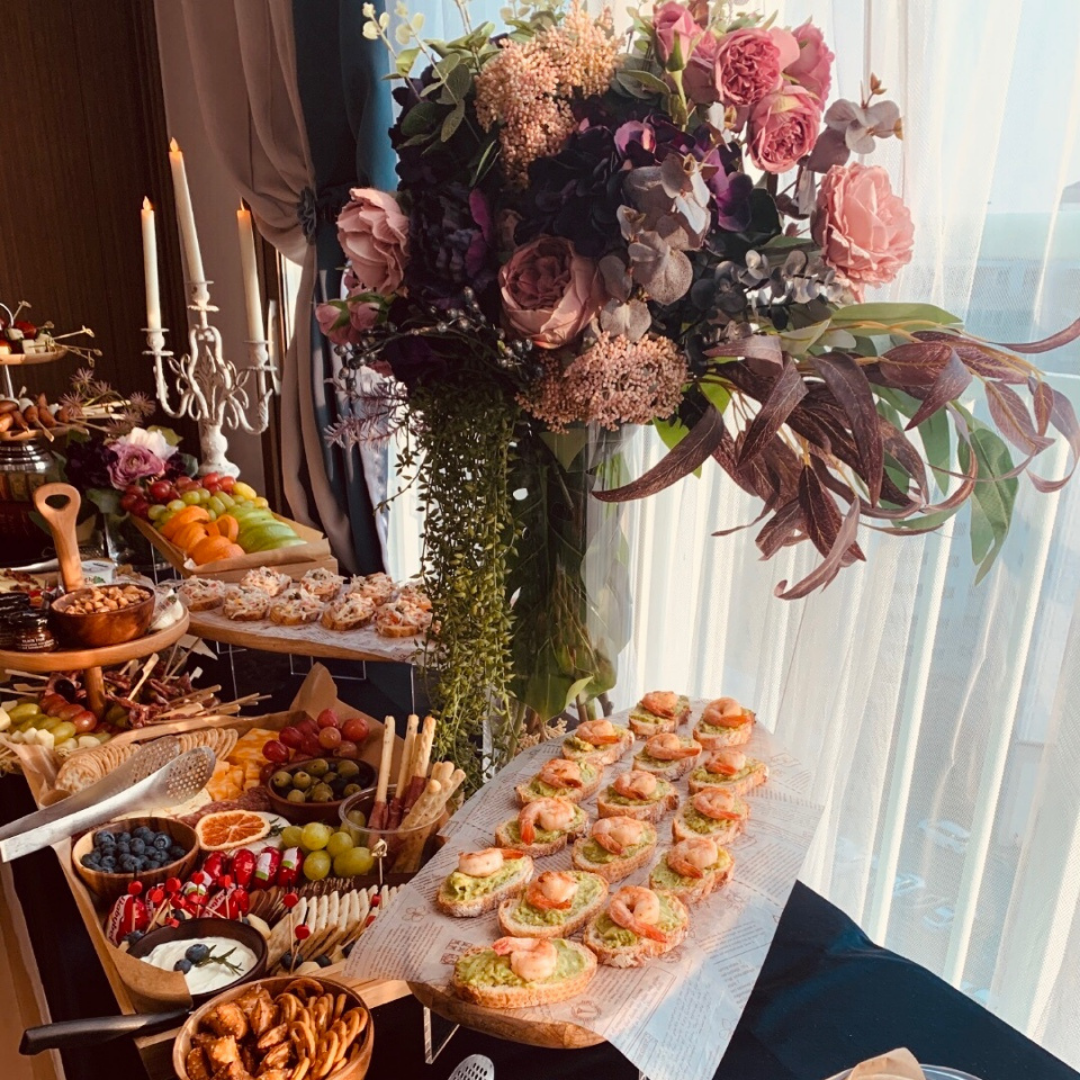 모두들 한번씩은 왔던 집이었는데, 이 집이 이랬었나 했다고 합니다. 거실에 있는 소파 색상과 어울리는 바이올렛, 핑크 계열의 스타일링을 잡아보았습니다. 집에 있었던 식탁은 음료바로 활용했습니다. 이보다 훨씬 많은 맥주와 술이 있었지만, 김치냉장고에 시원하게 두었다고 하네요.