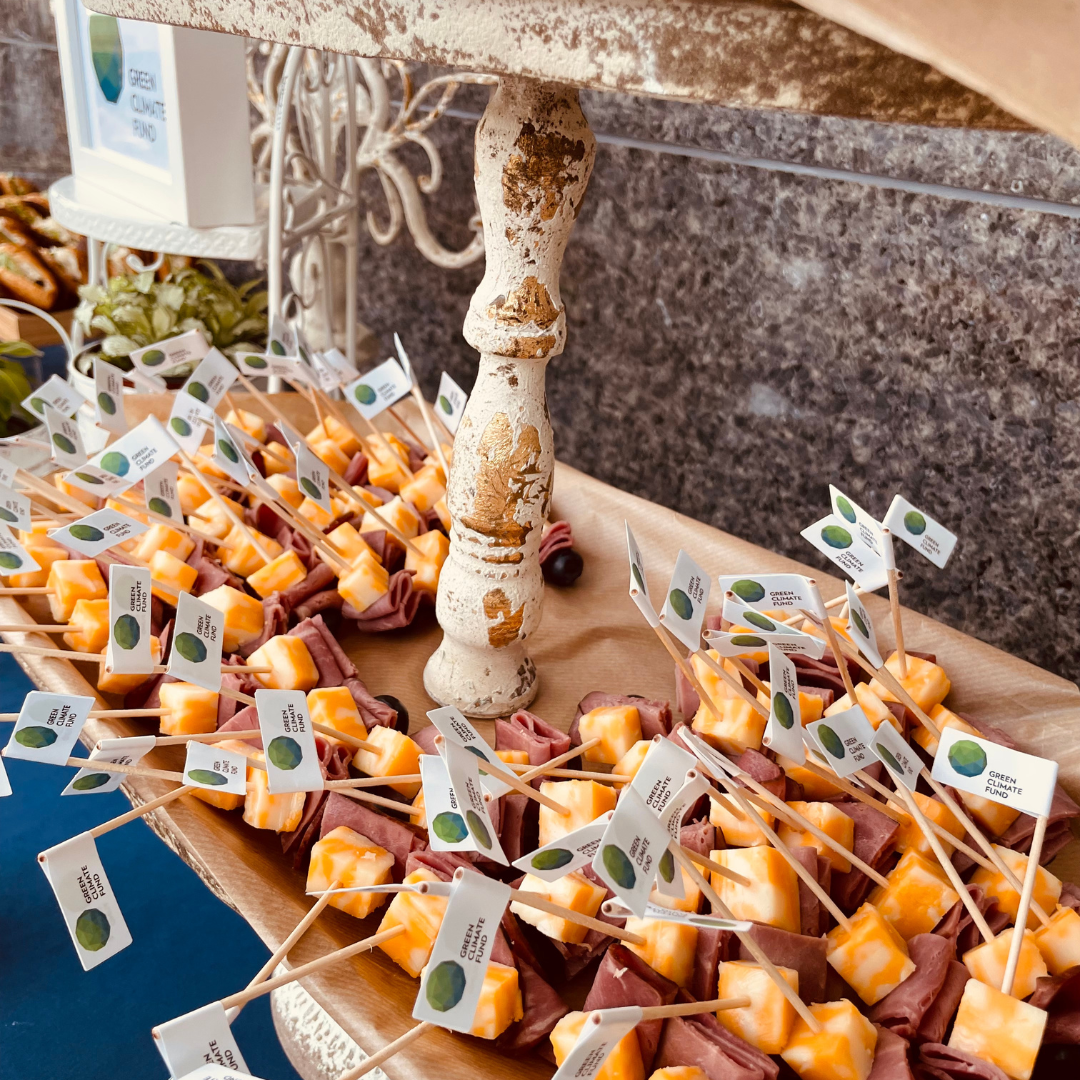 GCF는 국제적인 친환경 수준을 기준으로 하기때문에 그 무엇보다도 친환경적 제품 활용에 최선을 다해야 하는 조건입니다. 제공하는 모든 서빙툴은 다회용이거나 펄프 종이접시, 나무포크, 사탕수수를 원료로 한 종이컵을 활용하여 제공하였습니다. 모든 장식물 또한 종이를 이용한 배너, 화분 및 나뭇가지를 이용한 센터피스 등이 많은 칭찬을 받았습니다. 친환경적이지만 결코 아름다움에서도 뒤지지 않는 그건 행사를 원하시는 분들은 주목해 주시기 바랍니다.