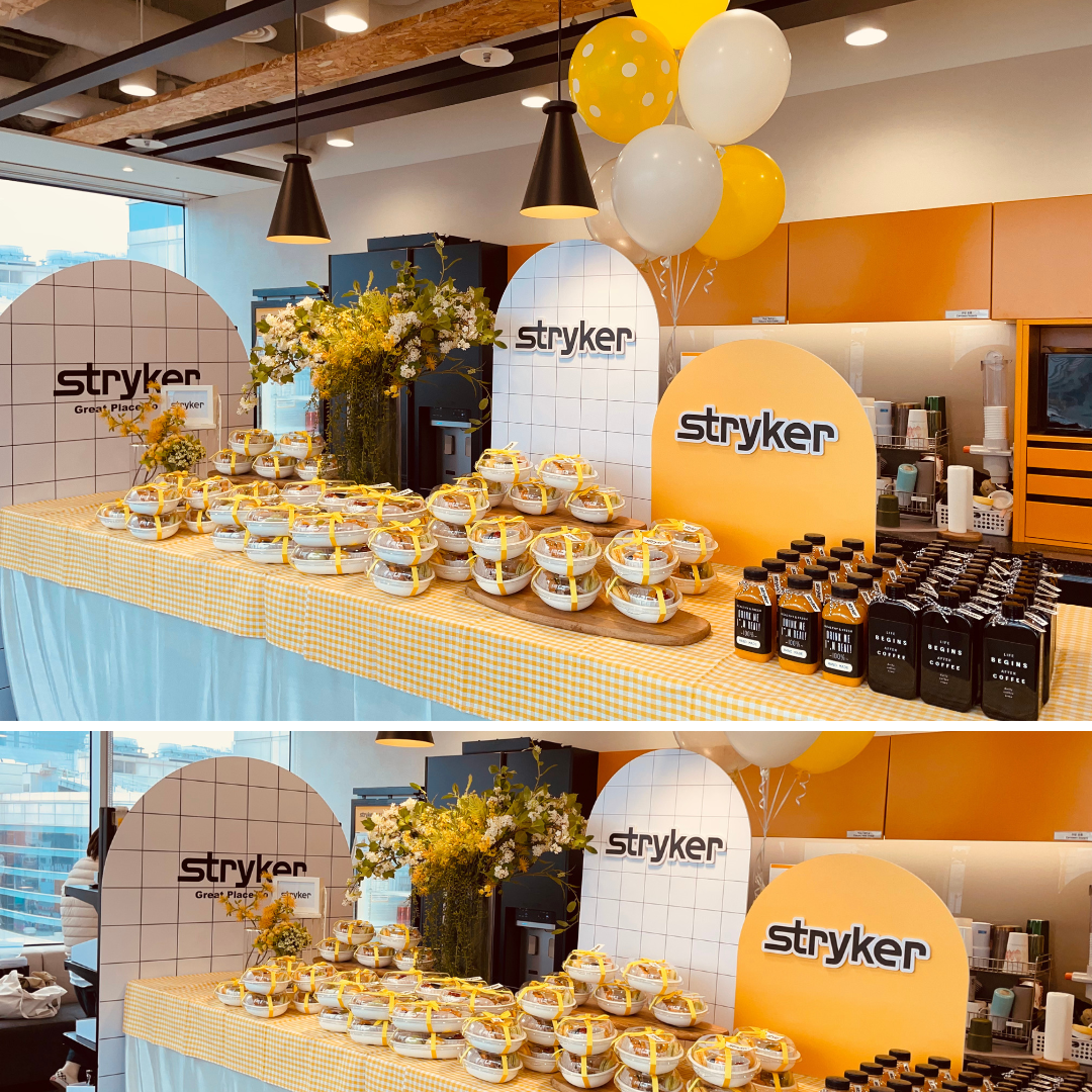 2022년 '봄 캠페인'을 시작으로 만나게 된 '스트라이커(Stryker)'가 이전 행사의 디자인과 행사가 맘에 들었다고 재주문을 해주셨습니다. 이전과 똑같이 해달라는 주문이었지만, 행사장 변경과 메뉴, 인원이 달라져서 새로운 디자인으로 세팅을 제안드렸습니다. 물론 이전처럼 똑같이 해달라는 것은 너무 쉽습니다. 그대로 하면 되니까요. 하지만 역시나... 현장에 도착해 보니, 메인세팅 장소도 변경되었고, 장소 테이블 높이, 조명도 많이 달라져 있었습니다. 그래서 준비해 간 POP 배치를 다시 배치해서 세팅을 완료했습니다.
